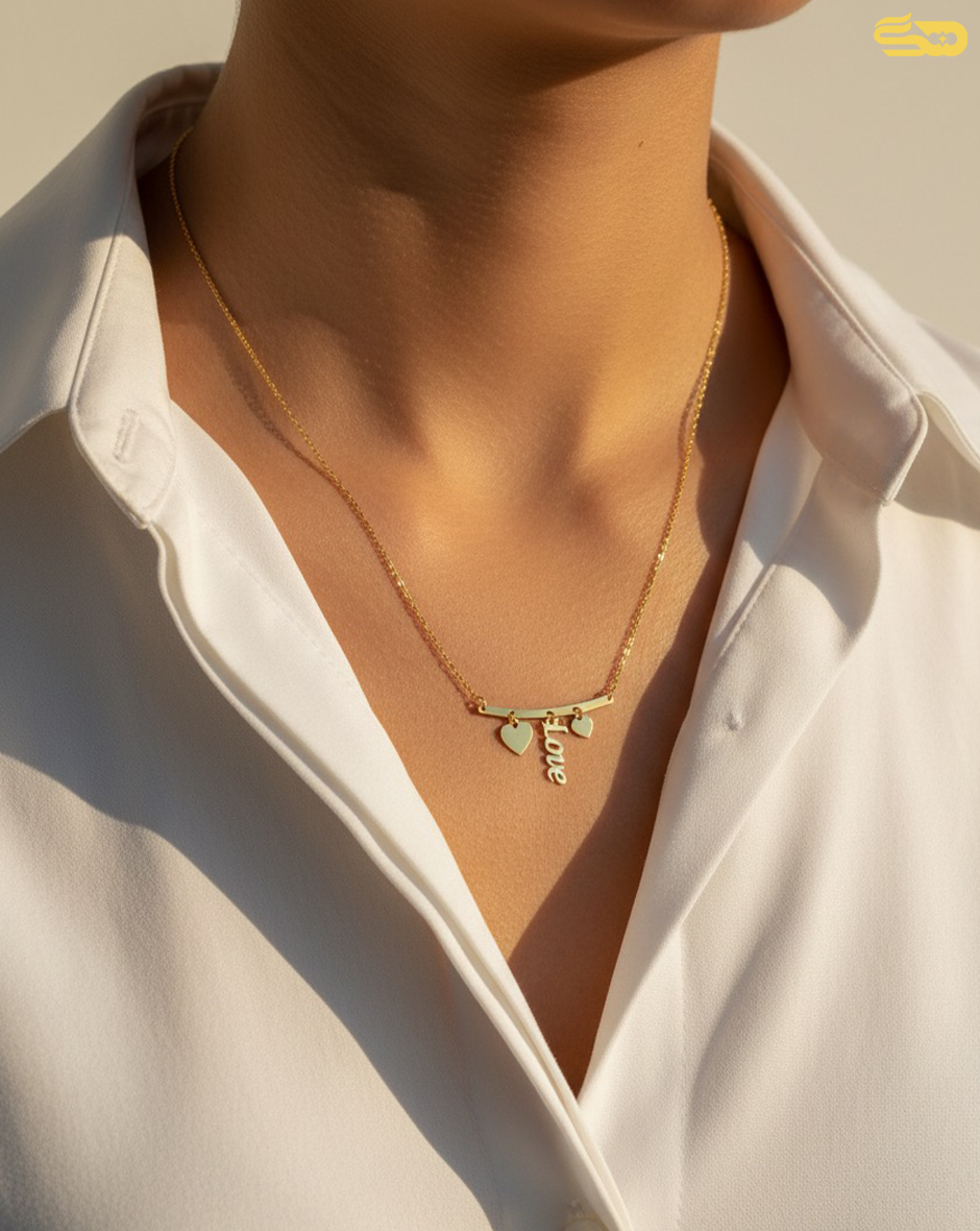 این گردنبند زیبا با طراحی ترکیبی از واژه‌ی "LOVE" و نماد قلب، پیام روشنی از عشق و محبت را منتقل می‌کند. نوشته‌ی ظریف "Love" که به‌طرزی هنرمندانه با قلب تلفیق شده، احساس صمیمیت، تعهد و گرما را در ذهن تداعی می‌کند.